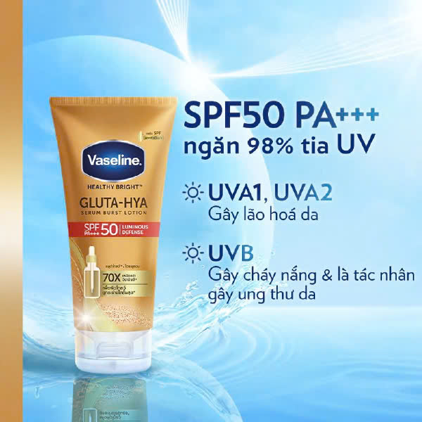 - Công thức serum dưỡng thể chống nắng độc nhất từ Vaseline, tan như nước trên da, thấm nhanh tức thì, không gây nhờn dính.