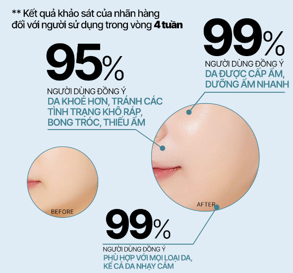 - 83% Nước sông băng Alaska được cấp giấy chứng nhận chứa hàm lượng lớn các vitamin, khoáng chất tự nhiên dễ dàng thẩm thấu nhờ phân tử nhỏ giúp cấp nước chuyên sâu cho da vừa nuôi dưỡng cấu trúc da khoẻ mạnh, vừa hỗ trợ chống oxy hoá, tăng sinh HA tự nhiên, duy trì độ mềm mại, đàn hồi của da