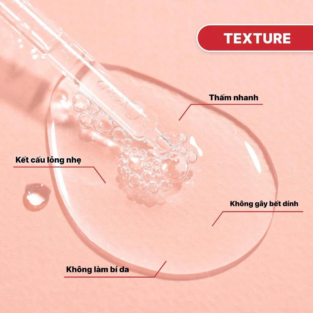 Kết cấu lỏng nhẹ, thấm nhanh, không gây bết dính, không làm bí da.Phù hợp với làn da dầu mụn, đặc biệt là da đang gặp vấn đề về thâm sau mụn.