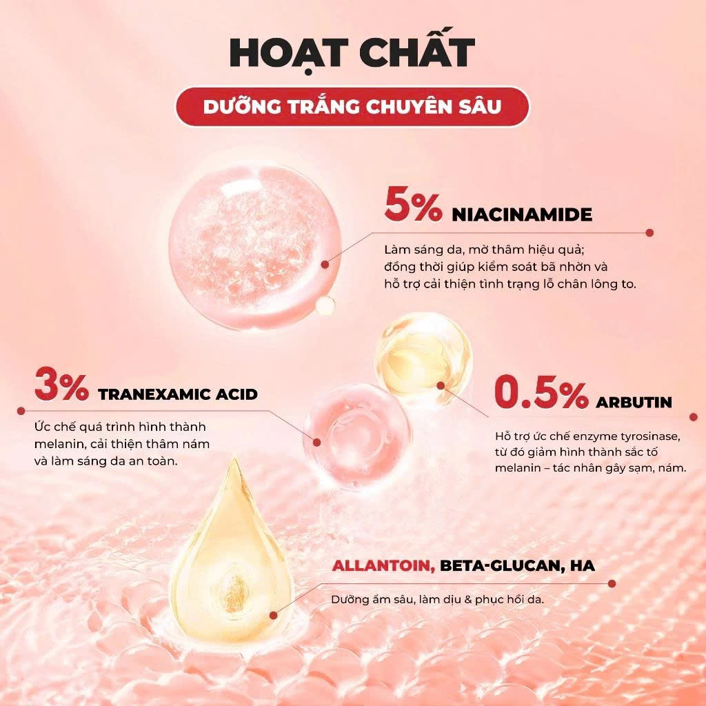 5% Niacinamide: Làm sáng da, mờ thâm đồng thời giúp kiểm soát bã nhờn và hỗ trợ cải thiện tình trạng lỗ chân lông to.