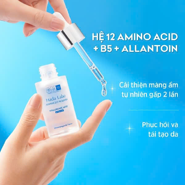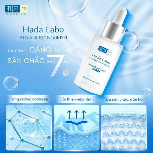 Hada Labo Advanced Nourish Hyaluronic Acid Serum Cấp Ẩm Tối Ưu, Phục Hồi Da 30ml là sản phẩm tinh chất đến từ thương hiệu Hada Labo - Nhật Bản. Sản phẩm chứa 2% hệ 7 loại HA (HA, Super HA, Nano HA, Fermented HA, Binding HA, Penetrating HA, 3D HA) và 12 loại Amino Acid giúp nuôi dưỡng làn da ẩm mượt suốt 48H, đồng thời cải thiện nếp nhăn, kháng viêm, làm dịu da hiệu quả.