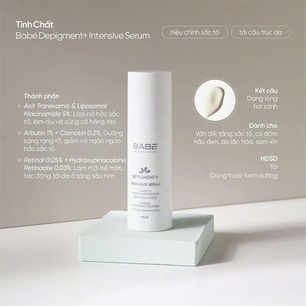 - Babe Depigment+ Intensive Serum là dòng tinh chất dưỡng sáng và mờ thâm hiệu quả cho da có vấn đề về sắc tố
