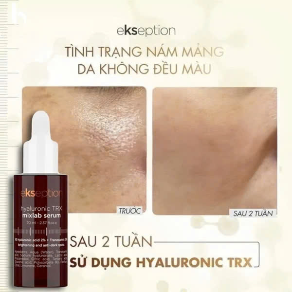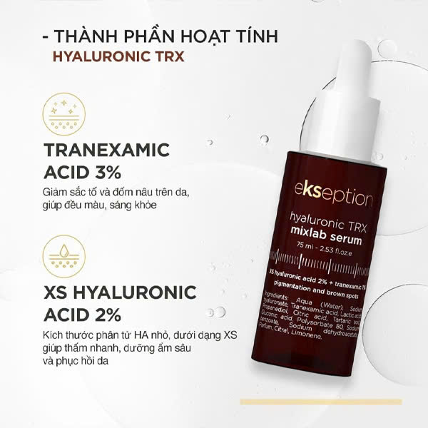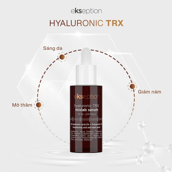 Serum Ekseption Hyaluronic TRX với công dụng làm sáng da, giảm sắc tố và các đốm đen nhờ vào thành phần chính là Tranexamic acid. Hoạt chất này ngăn chặn sự kích hoạt của các tế bào hắc tố từ tia cực tím (UV) và tế bào sừng bị tổn thương thông qua việc ức chế hệ thống hoạt động plasminogen, làm giảm hoạt động của men enzyme Tyrosinase từ đó ngăn chặn quá trình khởi tạo sắc tố melanin, phục hồi hàng rào bảo vệ da cũng như cải thiện những vấn đề sắc tố trên da nhanh chóng.