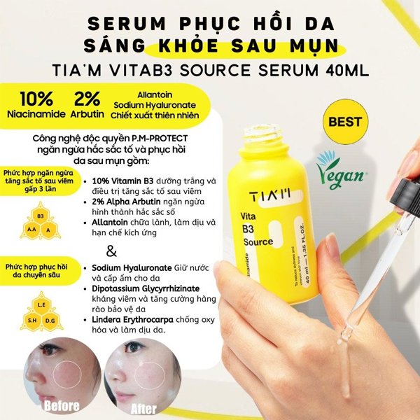 Serum Tia'm Tinh Chất Dưỡng Trắng Da, Phục Hồi Da Sau Mụn Tiam Vita B3 Source Serum là tinh chất dưỡng thuộc thương hiệu Tia'm đến từ Hàn Quốc với 10% Vitamin B3 (Niacinamide) và 2% Alpha Arbutin giúp cải thiện da nhanh chóng các vấn đề về sắc tố như thâm sạm, không đều màu, đặc biệt giảm thâm và phục hồi da sau mụn.