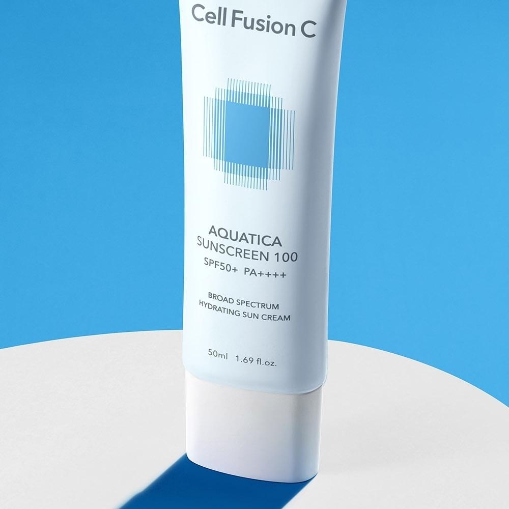 Kem Chống Nắng Cấp Ẩm Dịu Da Cell Fusion C Aquatica Sunscreen 100 SPF 50+ / PA++++ là sản phẩm chống nắng cho da mặt, dành cho da thiên khô, hỗn hợp khô, nhạy cảm đến từ thương hiệu mỹ phẩm Cell Fusion C của Hàn Quốc. Với màng lọc chống nắng vượt trội và thành phần giúp cấp ẩm sâu, sản phẩm không chỉ bảo vệ dưới ánh nắng mặt trời mà còn giúp làn da mịn màng, căng bóng tức thì.