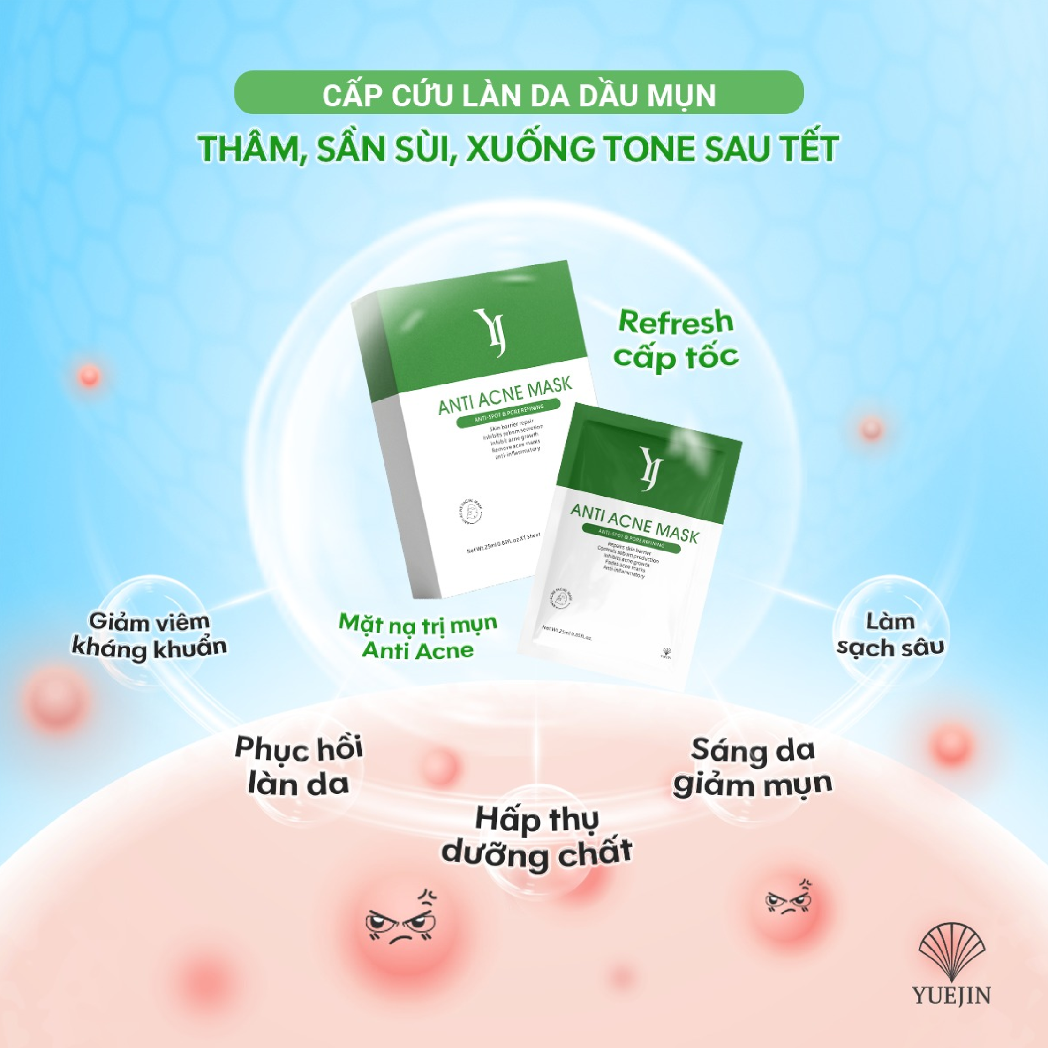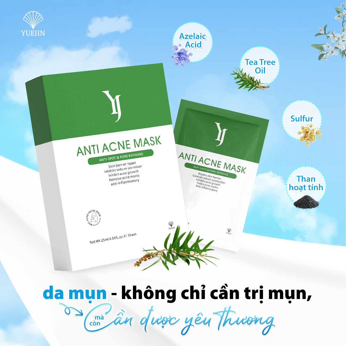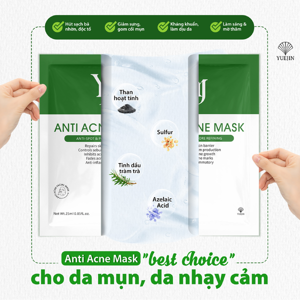 Mặt Nạ Giúp Giảm Mụn Yuejin Anti Acne Mask 25ml với chiết xuất từ các thành phần kháng khuẩn và chống viêm tốt như tinh dầu cây trà, sulfur, than hoạt tính…