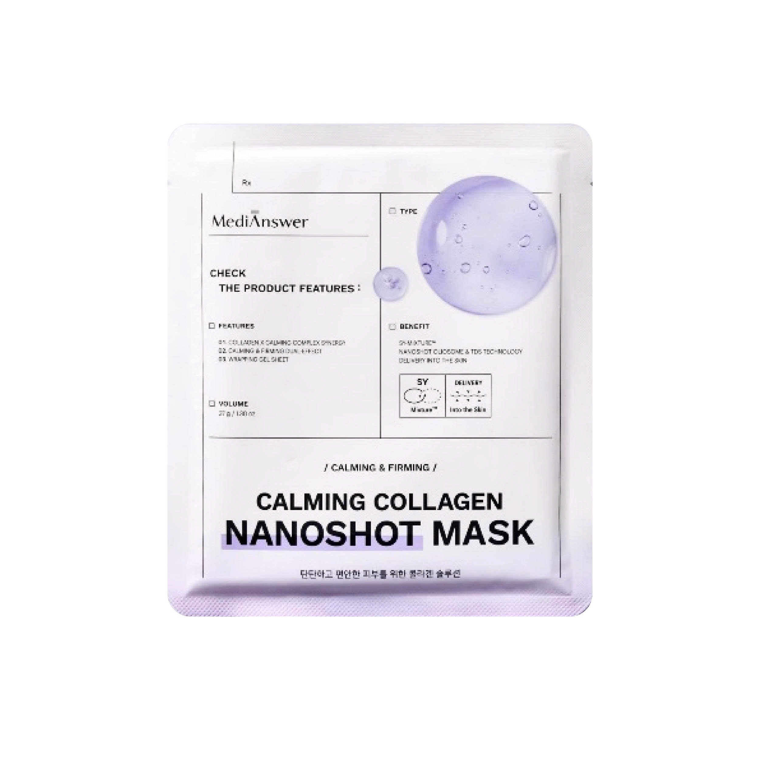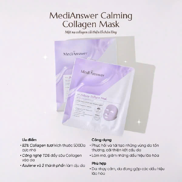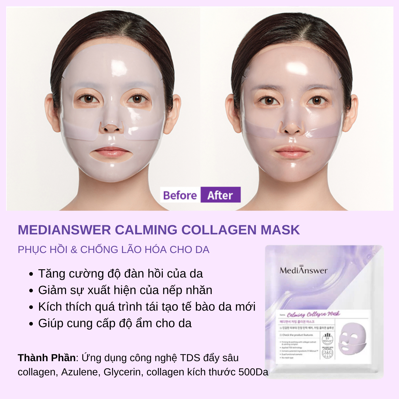 - Mặt Nạ Thạch Hỗ Trợ Phục Hồi Chống Lão Hoá MediAnswer Calming Collagen Mask với lớp mặt nạ dạng thạch có khả năng ôm sát vào các đường cong trên khuôn mặt kết hợp với công nghệ được cấp bằng sáng chế TDS của Medi Answer giúp các dưỡng chất của mặt nạ được hấp thụ nhanh chóng và hiệu quả vào sâu bên trong da để chăm sóc làn da khỏe mạnh.