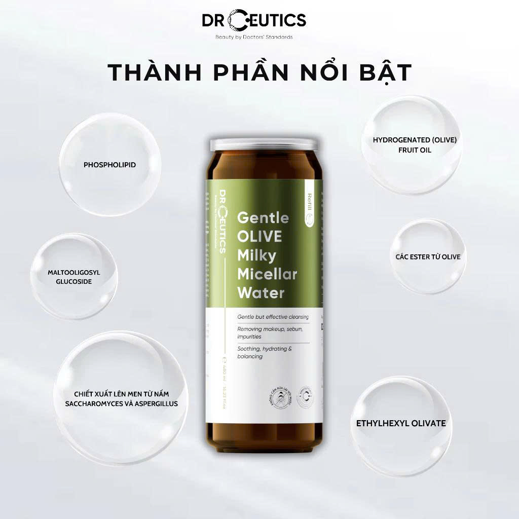 Được xem như là phiên bản nâng cấp so với sản phẩm nước tẩy trang đời đầu của nhà DrCeutics, Gentle OLIVE Milky Micellar Water với bảng thành phần quen thuộc nhưng được bổ sung thêm nhiều thành phần esters khác từ olive cùng công nghệ Micellar và kết cấu dạng sữa giúp tăng hiệu quả làm sạch. Bên cạnh đó, các dưỡng chất khác như phospholipids, chiết xuất lên men từ nấm men, oligosaccharide, tinh bột thủy phân giúp tăng cường sức khỏe làn da và giúp hỗ trợ chức năng hàng rào bảo vệ da. Sản phẩm thật sự lành tính, không gây cay mắt.