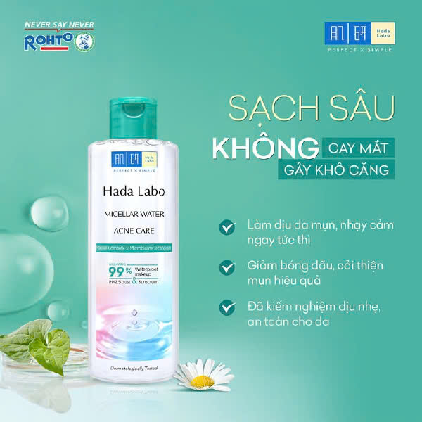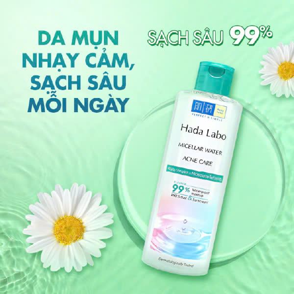 Nước Tẩy Trang Hada Labo Micellar Water Acne Care giúp làm sạch sâu 99% lớp trang điểm lâu trôi, kem chống nắng, bụi mịn PM2.5 kháng khuẩn, làm dịu da mụn, nhạy cảm.