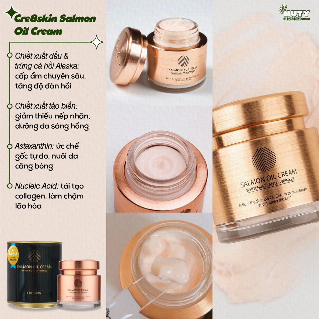 Cre8skin Salmon Oil Cream là kem dưỡng với các thành phần dưỡng da nổi bật như dầu cá hồi, trứng cá hồi, trứng cá muối, tảo biển, phức hợp L22,...giúp cung cấp độ ẩm dồi dào, duy trì làn da căng bóng, mịn màng, dưỡng da tươi sáng, làm mờ các nếp nhăn, thâm sạm, đẩy lùi các dấu hiệu lão hóa trên da thuộc thương hiệu Cre8skin đến từ Hàn Quốc.