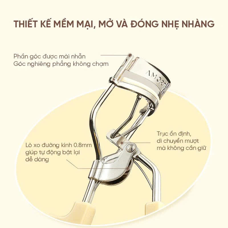 Kẹp Bấm Mi Amortals Curling Eyelash Curler được thiết kế với độ cong tiêu chuẩn vừa vặn với mắt người châu Á, giúp ôm trọn hàng mi từ đầu đến đuôi mắt. Khi sử dụng, lực kẹp ổn định giúp uốn cong hàng mi chỉ sau một vài thao tác. Kết hợp thêm mascara, mi có thể giữ nếp cong suốt nhiều giờ, hạn chế bị sụp mi giữa ngày.