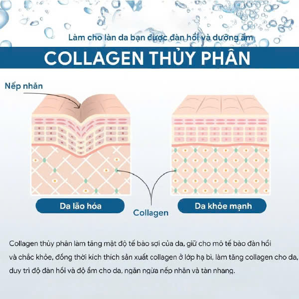 Collagen thủy phân: Cấp ẩm, bổ sung collagen giúp da căng bóng, đàn hồi.