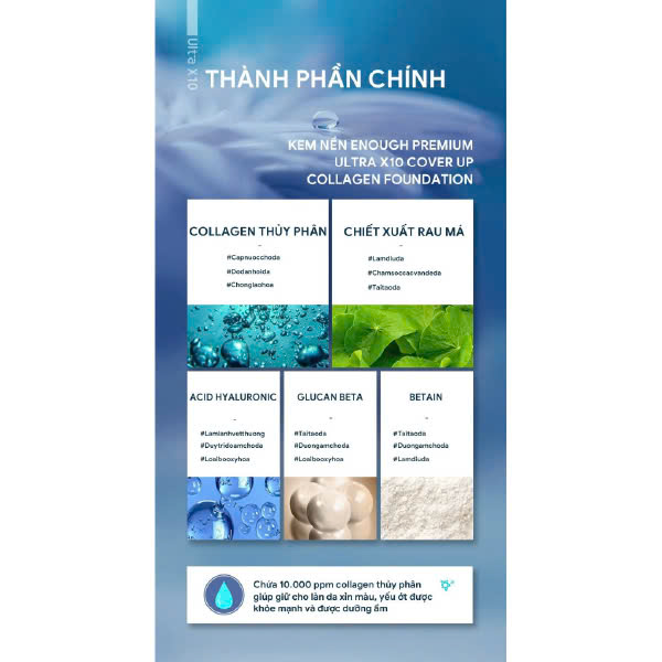 Thành phần Collagen thủy phân, Sodium Hyaluronate giúp cấp ẩm làn da, hạn chế tình trạng cakey hay mốc nền.