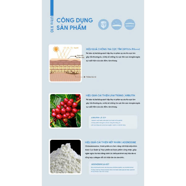 Chỉ số chống nắng SPF50 hỗ trợ chống nắng, chống lão hóa.