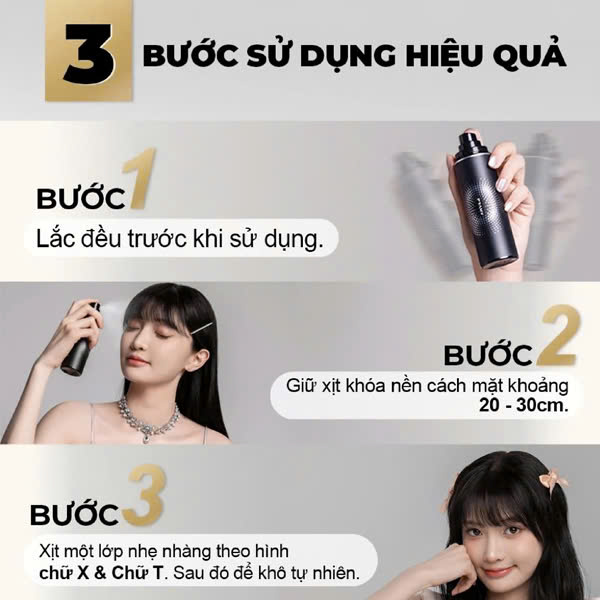Bước 5: Nếu muốn lớp trang điểm bền hơn hoặc có hiệu ứng căng bóng hơn, có thể xịt thêm một lớp nữa sau khi lớp đầu tiên khô hoàn toàn.