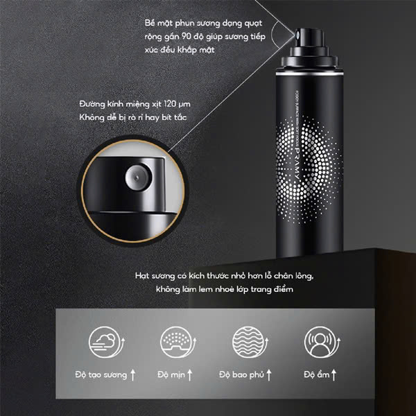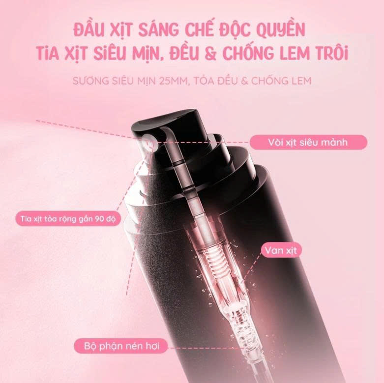 Công nghệ phun sương siêu mịn – Phủ đều, không gây bết dính: Đầu xịt phun sương dạng quạt góc rộng 90 độ, giúp phủ sương đều khắp mặt mà không làm trôi lớp nền. Đường kính miệng xịt chỉ 120µm hạn chế rò rỉ hay bít tắc, giúp tạo giọt sương nhỏ hơn lỗ chân lông, hạn chế tình trạng bết dính hay lem nhem trang điểm.