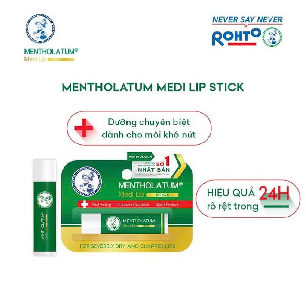 Son Dưỡng Môi Rohto Chuyên Biệt Cho Môi Khô, Nứt Nẻ Mentholatum Medi Lip Stick là dòng son dưỡng môi đến từ thương hiệu mỹ phẩm Rohto của Nhật Bản, cải thiện khô nứt, dưỡng môi ẩm mịn nhanh chóng, bảo vệ và hỗ trợ phục hồi môi khô khỏi tác động của thời tiết lạnh, khô hanh, thường xuyên tô son và môi khô cơ địa.