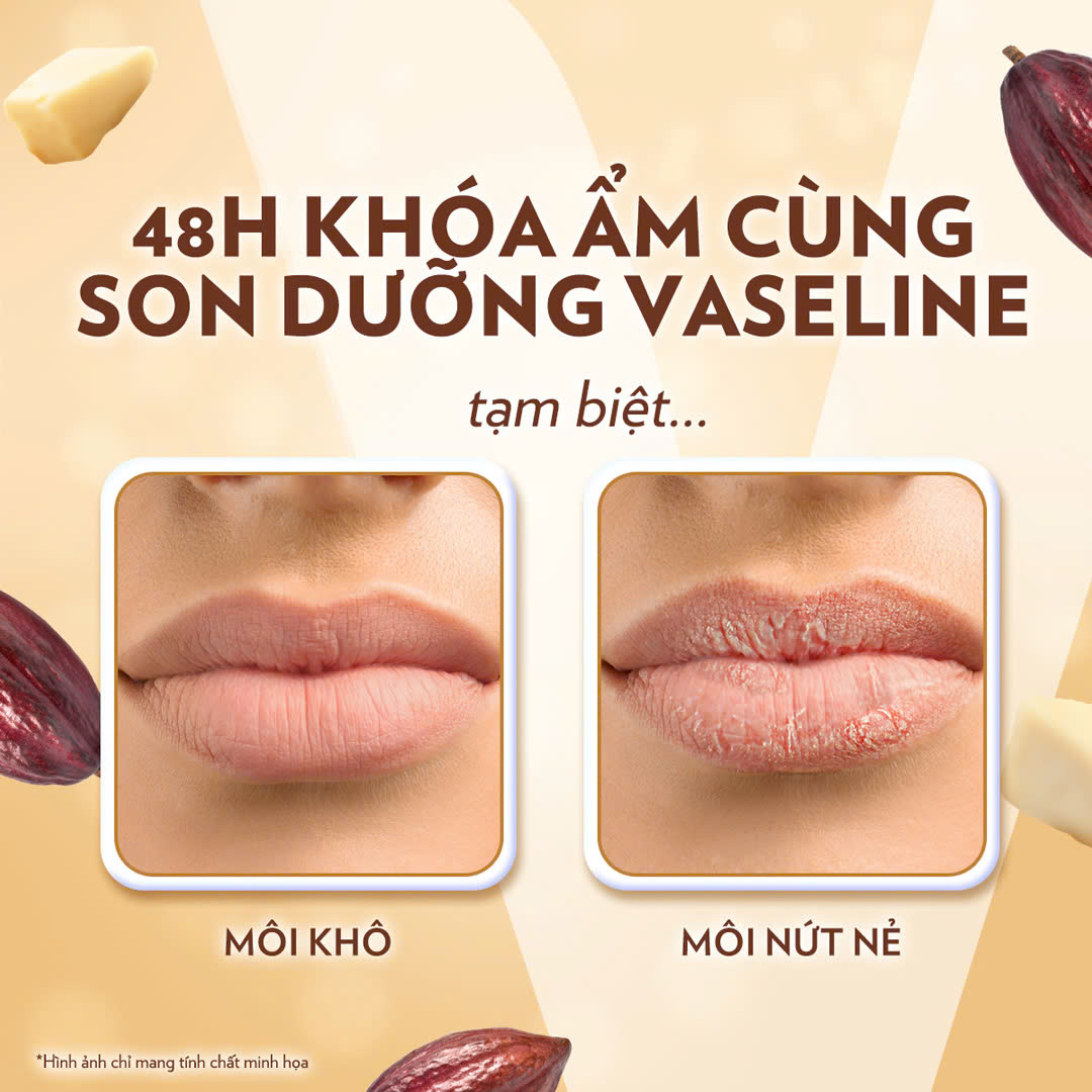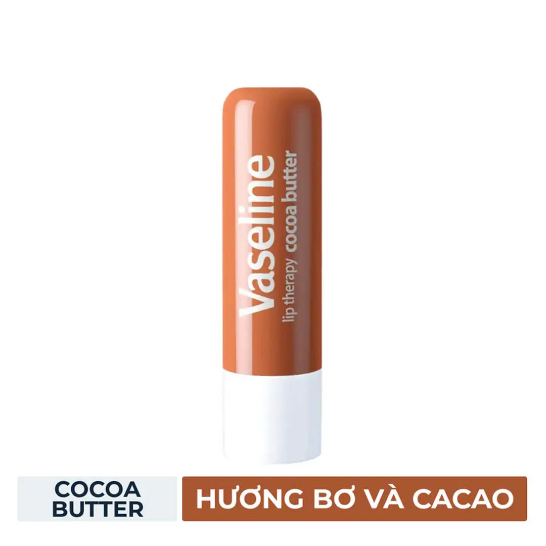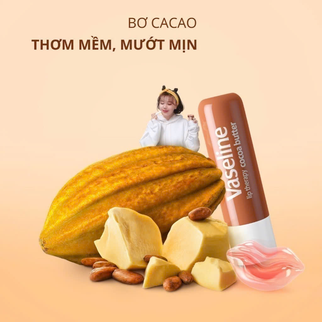 Son Dưỡng Môi Vaseline Chiết Xuất Bơ Cacao 4.8g: với thành phần Petroleum jelly cùng chiết xuất Cacao và bơ hạt mỡ giúp đôi môi luôn mềm mịn